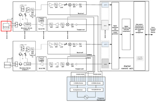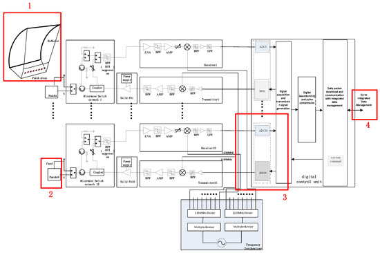 In the described phased array digital beamforming scatterometer system, the spaceborne system architecture consists of a shared reflector antenna, feed source, microwave front-end unit, power amplifier unit, transmitter unit, receiver unit, frequency synthesizer unit, and digital signal processing unit [14,15,16]. The array comprises ten transceiver channels, each operating independently. The system diagram is depicted in Figure 1. Given the size of the aircraft and the flight altitude for the flight tests, the system used in this testing is not identical to the actual spaceborne system. Instead, a portion of the spaceborne system equipment was employed. The structure of the airborne verification flight system is illustrated in Figure 2. There are some differences in the design and implementation of spaceborne and airborne scatterometer systems. These differences primarily involve the antenna, TR components (including the transmitter unit (T) and receiver unit (R)), the number of front ends, and data storage systems, highlighted in red boxes in Figure 1. Due to constraints in spacecraft space and power, the number of TR components, front ends, and antennas in the airborne scatterometer system is half that of the spaceborne scatterometer. Nevertheless, by adjusting the phase and amplitude of the array channel signals, digital beamforming (DBF) can still be achieved to test the system’s ability to precisely direct and focus signals. In contrast to the data storage of the spaceborne scatterometer, the airborne scatterometer system stores data on a computer. However, this does not impact the validation of the spaceborne scatterometer’s data acquisition and storage chain functionality. Another significant difference is that the scatterometer system used in aerial flight tests does not include a cylindrical reflector antenna; instead, an antenna array is used to replace the beam focusing function. In summary, while there are differences between the airborne and spaceborne scatterometer systems, the effective validation of critical functions, processes, and algorithms can still be achieved through a simplified system design. This facilitates the validation and optimization of system performance in more complex real-world environments and provides guidance for future enhancements.