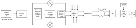 where t is the time from the onset of each pulse, is the total emitted energy, stands for the pulse power envelope such that , is the carrier frequency, is the Doppler compensation frequency, and is the chirp rate of the linear frequency-modulated pulse. In practice, the Doppler compensation frequency is defined as a function of the beam azimuth angle. It can be configured for different channels using a look-up table (LUT) and is stored in a static random access memory (RAM) of the Salinity Satellite scatterometer data processing unit.