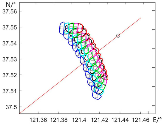 Figure 7 depicts a schematic diagram illustrating the airborne scatterometer’s beam scanning footprint and slice division. In the diagram, the black elliptical regions represent the antenna footprints of 11 beam positions. The colored blocks delineate the division of each footprint into slices, and each footprint can be further divided into five slices. This visual representation provides an overview of how the scatterometer’s beams cover the designated area and how these beams are subdivided into individual slices for analysis. The segmentation of each footprint into multiple slices allows for a detailed examination of backscatter characteristics within specific portions of the observed region.
