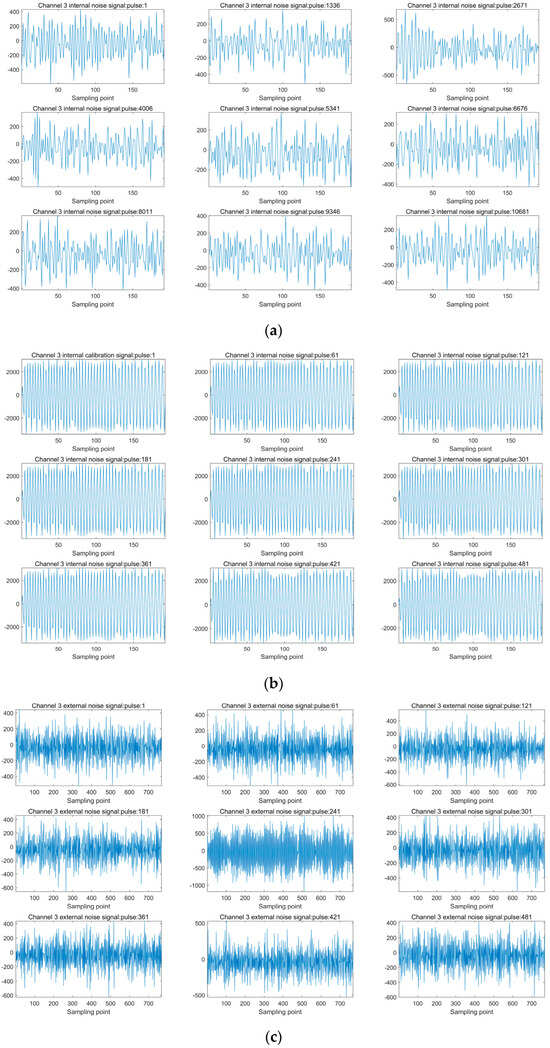 Figure 8a displays the variation of the internal noise signal for channel three over time. It can be observed that the values of the internal noise signal fluctuate within the range of −400 to 400, showing a relatively stable trend. This indicates that the internal noise signal experiences limited variation across a series of pulse moments, reflecting little change in matching impedance and receiver temperature during the measurement period.