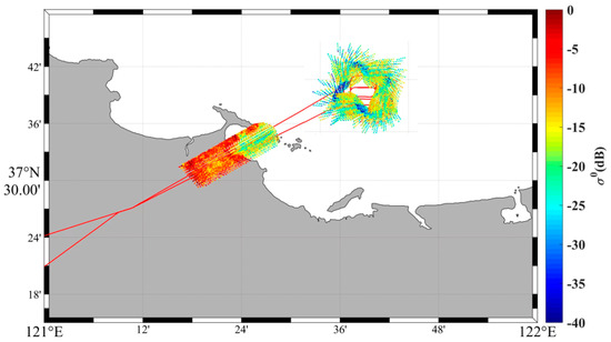 Figure 10 presents the spatial distribution of backscatter coefficients measured in the airborne experiment of the digital beamforming scatterometer [31]. In the figure, the red trajectory represents the flight path of the test aircraft, while the data points represent the actual measured backscatter coefficient values. The upper part of Figure 10 displays the distribution obtained during the aircraft’s flight around the offshore platform. The measured backscatter coefficients align with the expected patterns, but some strong scattering points are observed. These may be influenced by the presence of ships navigating in the surveyed sea area, requiring further analysis in subsequent studies. The lower part of Figure 10 shows the distribution at the boundary between land and sea, where there is a clear distinction in the backscatter coefficients between the marine and terrestrial regions, creating a distinct demarcation line between the ocean and the land.