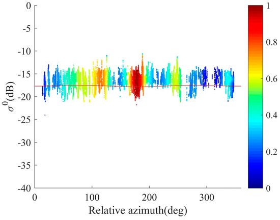 Additionally, this study also compared and analyzed the azimuth modulation of the measured data from the airborne experiments of the Salinity Satellite scatterometer with the GMF (geophysical model function) model [32,33,34]. Figure 11 presents an illustrative plot of the variation in backscatter coefficients with the azimuth angle, for an incident angle of 38°. The red curve represents the conceptual variation of L-band backscatter coefficients with the azimuth angle, according to the GMF model. In contrast to the Ku-band, the modulation effect of L-band backscatter coefficients with the azimuth angle is less pronounced. The scatter points on the plot reflect the distribution of measured data obtained from the airborne experiment. Upon observing the data in the figure, it is evident that the results obtained by the Salinity Satellite scatterometer align closely with the changing trend predicted by the GMF model, albeit with minor discrepancies. This experiment provides initial evidence for the feasibility of using phased array scatterometers for measuring ocean backscatter coefficients. Going forward, efforts will be dedicated to further improving the performance of this scatterometer system to achieve higher measurement accuracy and reliability.