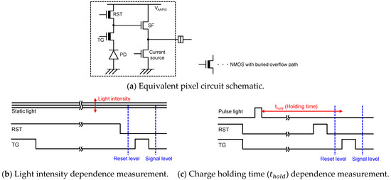 In almost all the recent CMOS image sensors, P+NP pinned PD is used as the photo detector [10,11,12]. It has been observed that PDFWC is dependent on the light intensity and transfer gate potential [13]. Although, in our HDR sensor development [7,8,9], we have found that PDFWC also changes with light intensity, as shown in Figure 1a, as it has different behavior with respect to the transfer gate voltage during integration compared to [13]. Also, we have shown that PDFWC decreases as the time interval between the end of pulsed light exposure and the start of signal readout [14], which is referred to as the charge holding time, increases, as shown in Figure 1b. Equivalent pixel circuit [7,8,9] schematic and pulse timing diagrams to obtain the results, shown in Figure 1a,b, are shown in Figure 2. The differences between the conventional rolling shutter pixel and this pixel are the buried overflow path under the TG and the in-pixel current source. Although the current source is equipped to perform the global shutter operation, we have confirmed that it does not affect our PD analysis.