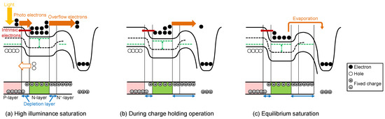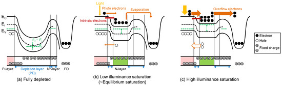 Figure 4 shows potential and charge distribution changes from PD reset to PD saturation based on [26]. The fully depleted condition after the electronic shutter is shown in Figure 4a, where no electrons exist inside the PD, and the relationship holds. Figure 4b shows a low illuminance saturation case. Here, the PD saturation is determined by the balanced condition between the input and output currents of the PD. Therefore, the intrinsic PD current, which flows from the p-layer to the n-layer, balances with the overflow current (evaporation or thermionic current) in Figure 4b because of the low light intensity, and thus there is a small photo-current. When the light intensity is high, as shown in Figure 4c, i.e., in a high light illuminance saturation case, the photo-generated current balances with the overflow current.