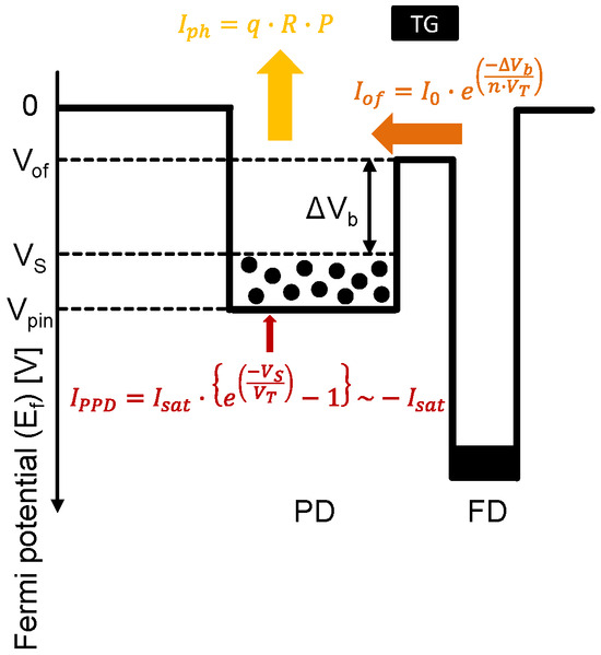 Although similar models in [13,14,15,16,17] are used in this work, minor modifications are needed for our pixel [7,8,9] because of its unique structure with the buried overflow path under the transfer gate [4,5,6]. Figure 3 shows the PD cross-section and potential of the buried overflow path, which is formed by the low concentration n-layer under TG. Generally, to prevent the dark current at the Si surface under TG, a negative TG bias voltage is applied [22,23,24], and the surface potential becomes low. On the other hand, electrons above the PD saturation level overflow to FD through the buried overflow path because the potential of it is higher than that of the surface region. As a result, both good overflow efficiency and low dark current can be achieved in this structure. In this work, the potential barrier height of the buried overflow path is not affected by the TG-negative bias voltage because it is formed deep enough in the Si bulk region. It is different from the models in [13,14,15,16,17] because TG voltage is not a parameter anymore. Also, our TCAD simulation shows the parameters of equations and the actual potential distribution. We confirmed that it shows good evidence of the analytical model, which was not described in [13,14,15,16,17].