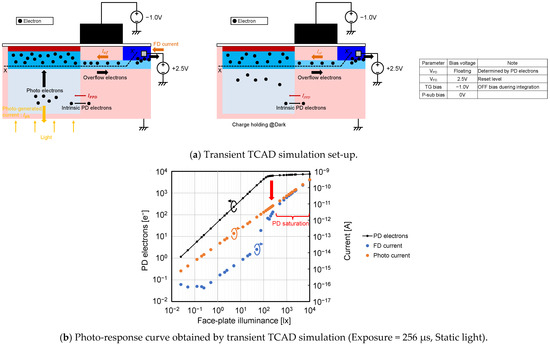 Next, the light intensity dependence and the charge holding time dependence of PDFWC were analyzed. Figure 11a shows the simulation set-up for it. In contrast to Figure 10a, the PD electrons are generated by an external light source in this simulation. Figure 11b shows the photo-response curve, the FD current, and the photo-generated current under the static light condition. In the PD saturation region, it is obvious that Equation (4) holds with .