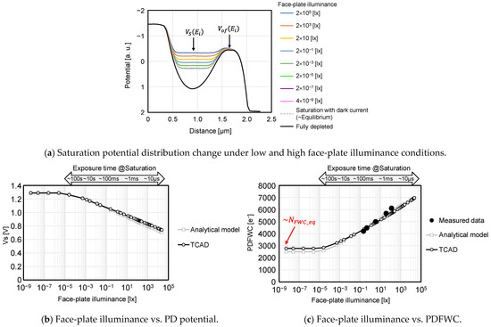 Next, the relation between the light intensity and the PD potential in Figure 12a is shown in Figure 12b. Furthermore, the relation between the light intensity and PDFWC is shown in Figure 12c. The TCAD simulation result of Figure 12b and Equation (5) agree well, and the PD potential decreases logarithmically. The characterization result matches the simulation and the analytical model of Figure 12c and Equation (7). In Figure 12b,c, the flat level is determined by the ratio of to , as indicated by Equation (8).