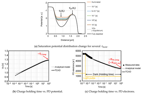 Figure 13 compares the analytical model and TCAD simulation of the charge holding time dependence of PD potential and PD electrons. Figure 13a shows the potential distribution change from PD saturation to the equilibrium PDFWC under dark conditions after pulsed light illumination. During the pulsed light illumination, PD is oversaturated in this simulation and measurement. It is seen that the PD potential increases as the charge holding time increases, and finally, the potential reaches the equilibrium condition.