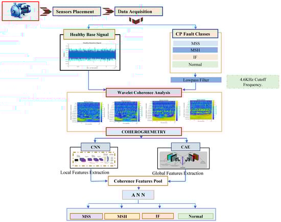The proposed method for categorizing faults in a CP involves a combination of signal processing and DL techniques. Initially, to isolate fault-specific frequencies, the sensor is attached to the CP and acquires a vibration signal that is preprocessed through the use of a low-pass filter with a cutoff frequency of 4.6 kHz. Following the preprocessing step, wavelet coherence analysis is applied to convert the 1D signals to 2D signals to find the time-localized oscillation in the signals. We attain the coherent images as an output. The visual representation highlights coherence patterns and structures within the signals, aiding in interpretation and providing a convenient visualization of frequency component relationships according to the health state of the CP, a representation known as a coherogram. Subsequently, a CNN for local features and a CAE for global features are employed to extract CP health-sensitive features from the coherograms, creating a feature pool. These features are then fed into an ANN model to convert the feature image to a feature vector and then utilize these features to identify the ongoing health conditions of the CP (normal, IF, MSH, and MSS). Figure 1 shows an abstract diagram that illustrates the proposed approach.