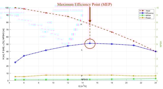 The determination of the pump’s maximum efficiency point (MEP) is essential to optimize pump performance. This value helps to determine the flow rate and the net positive suction head (NPSH) of the pump that is most effective. With the flow rate change, the head, energy consumption, and efficiency of the pump also change, producing a characteristic curve. The MEP is the point at which the pump performs most efficiently on this curve. Figure 2 shows the characteristic curve and MEP of the PMT-4008 pump.
