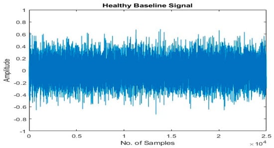After conducting a thorough examination, it became apparent that the most optimal healthy baseline signal from the MEP samples should exhibit a sample mean similar to the mean of the pump’s healthy vibration signals, while also being the furthest from the sample means of other classes, such as MSH, MSS, and IF. Our experiments have demonstrated that this criterion for selecting the healthy baseline signal significantly improves accuracy. However, randomly selecting a healthy baseline signal leads to a decline in classification accuracy. It is crucial to emphasize that the pump’s healthy vibration signals are only obtained under normal operating conditions. The healthy baseline signal selected based on this criterion is depicted in Figure 3.