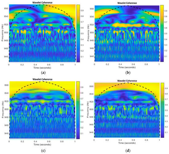 In order to visually observe the coherence of the whole frequency band and the frequency band of noise and fault signal, the wavelet coherence spectrum of and is formed. In the wavelet coherence spectrum, the brightness of the color expresses the coherence. When diagnosing IF in centrifugal pumps using this spectrum, yellow regions indicate operational normalcy, blue regions highlight discrepancies, and green regions suggest transitional dynamics. Yellow reveals typical behavior for MSH issues, blue uncovers seal-hole influences, and green implies minor disturbances. When analyzing MSS, yellow signifies consistency despite the MSS, blue flags disturbances, and green hints at evolving impacts. Even in normal pump operation, yellow shows synchronization, blue may reflect minor fluctuations, and green represents transitional dynamics. However, these color-coded insights guide maintenance and monitoring efforts, focusing on blue regions for timely interventions and repairs in faulty conditions. However, the dashed line in each coherogram represents the cone of influence (COI), which is a region of the time–frequency plane where edge effects can distort the wavelet transform.
