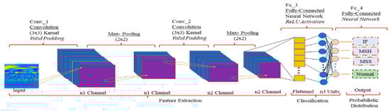 Here, X represents the input characteristic, such as a piece of text, an image, or a vibrational signal received from the sensor; are the trainable parameters, i.e., weights and biases; employ either linear or nonlinear activation functions in corresponding layers. The function f(X) involves multiple activations, convolutions, and pooling operations on a collection of input features denoted as X, with the aim of generating a predicted label.