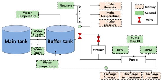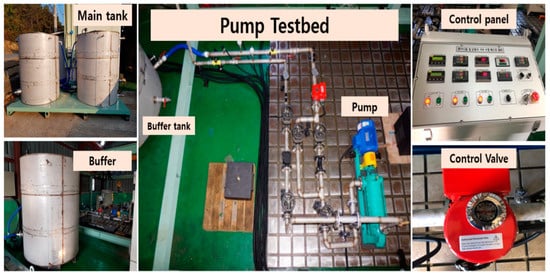 The PMT-4008, a frequently utilized pump in the industry, has been designed for experimental purposes. It is equipped with a 5.5 kW motor, a control panel featuring an ON/OFF switch, a speed controller, a flow rate controller, a temperature controller, a water supply controller, pressure gauges, display screens, clear steel pipes, and two tanks (buffer tank and main tank). Figure 7 and Figure 8 depict the experimental setup and a diagrammatic representation of the system, respectively. After the primary setup was established, the test rig was operated to facilitate water circulation within a closed loop from the main tank to the buffer tank. The CP vibration data were recorded using four accelerometers. Two accelerometers were affixed to the pump casing, while the other two were placed near the impeller and the mechanical seal. Each sensor utilizes individual channels to capture the vibration of the pump.