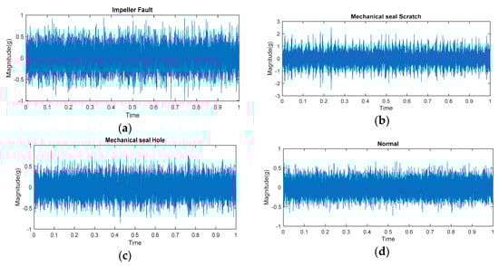 CP vibration signal under different operating conditions: (a) an impeller fault condition, (b) a mechanical seal scratch condition, (c) a mechanical seal hole condition, and (d) a normal condition.