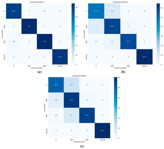 Confusion matrices of (a) the proposed model, (b) Weifang Sun et al. [40], and (c) Prosvirin et al. [41].