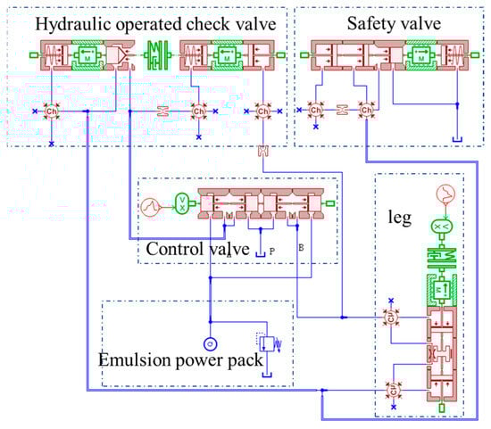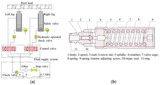 The powered supports in a longwall mining system must be compatible with the requirements to control the roof and floor to ensure the safety of the machines and workers [1]. Powered roof supports are divided into units, which consist of mechanical structural components, hydraulic systems, and electrohydraulic control systems. The main element of the hydraulic system of powered supports is the hydraulic legs, which extend between the canopy and sill piece [2,3,4]. These hydraulic legs ensure that an adequate force is maintained on the roof of the longwall face in the section. Protection against excessive pressure is provided by a special safety valve. This safety valve governs the maximum working resistance of the system; its adaptability and reliability are critical factors that influence the safety of both the support structure and roof [5].