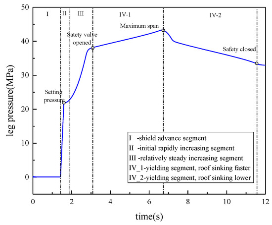 (1) Control valve action: The control valve is in fluid feed mode, resulting in the column ascending, with the interaction with the roof lasting 1.6 s. The control valve remains in the neutral position for 10 s. (2) Roof displacement load: The initial gap between the roof and the column is 300 mm. Prior to roof catching, the roof’s speed remains at 0. Subsequent to roof catching, the roof’s motion splits into two stages, transitioning from 0 to 0.17 m/s and then from 0.17 to 0 m/s, each undergoing a 5 s simulation. Consequently, the duration of the total simulation is 11.6 s. The pressure in the lower chamber of the column is shown in Figure 3. The pressure curve can be divided into four segments according to the rate of pressure change. The first segment is the shield advance segment, where the pressure is maintained at approximately 0.05 MPa. The second segment is the initial rapidly increasing segment, where the leg rises, the hydraulic check valve closes, and the pressure is as high as 22 MPa. The third segment is a relatively steadily increasing segment, where the roof sinks, and the pressure slowly increases. The final segment is the yielding segment: the roof rapidly sinks, the safety valve opens, and the leg maintains constant resistance.