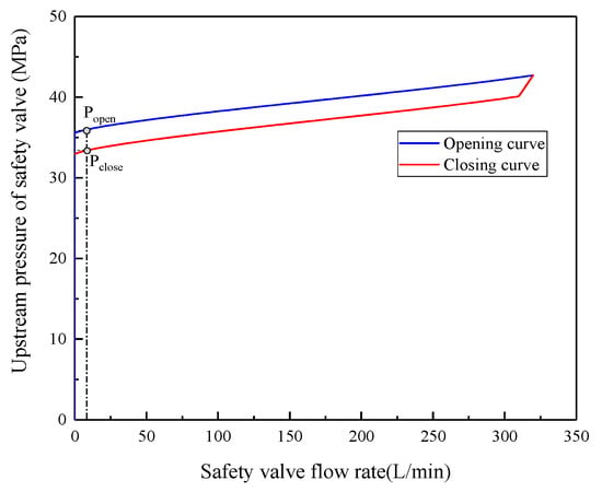 - The service life and failure probability of the safety valve are strongly related to the number of valve openings [30]. The FAD320/40 safety valve, examined in this study, has a recommended cycle count of 3000 times, as specified by the manufacturer. The peak pressure typically reaches around 40 MPa, with the reseating pressure being approximately 1.3 MPa lower. The unloading and pressure recovery times generally range from 0 to 5 min. As the number of valve openings increases, the various parameters of the safety valve generally remain within an acceptable range. Based on the safety valve’s opening and closing characteristics (Figure 4), a maximum opening pressure of 45.8 MPa corresponds to a flow rate of 330.2 L/min, which essentially satisfies the on-site application requirements.