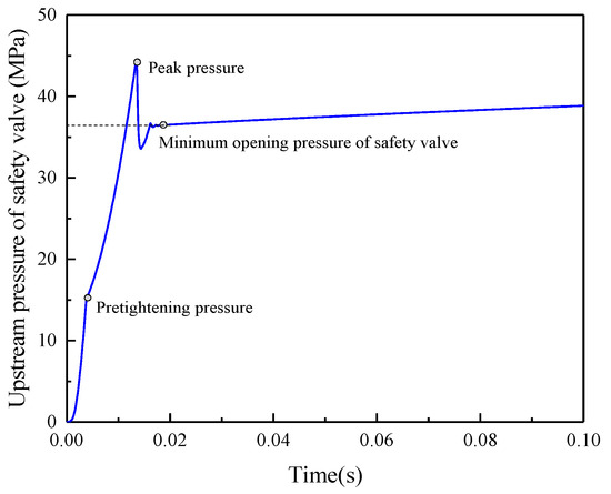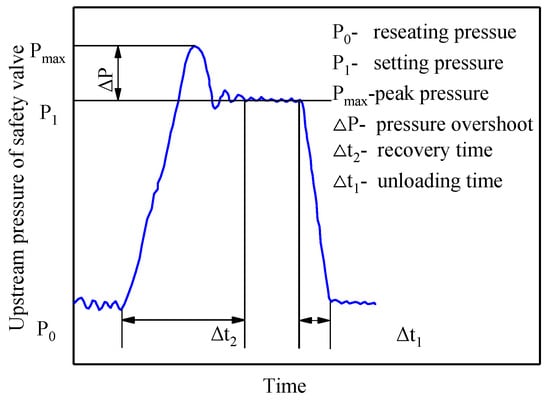 Based on the time–pressure curve of the powered support column, the characteristic parameters of the selected safety valve were determined, as shown in Figure 8, which included static characteristic indices such as the peak (), reseating (), and blowdown () pressure, and dynamic characteristic indices such as the pressure recovery () and unloading () time. The specific definitions of these indices are as follows:
