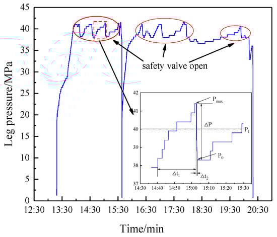 In certain application scenarios, such as in nuclear power plants and oil exploration, where precise safety valve monitoring is crucial, the operational status is typically monitored by simultaneously tracking parameters such as the pressure, flow rate, and spool displacement [8,22]. In contrast, for cartridge safety valves employed in a powered support, where the monitoring precision is less critical, monitoring is primarily limited to the column pressure. The time–pressure curve of a typical safety valve opening is shown in Figure 8.