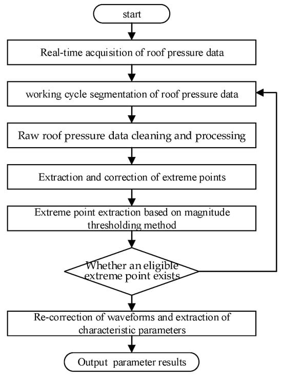 A flow chart of the extraction method is shown in Figure 9. From the panel, real-time roof pressure data can be obtained through the mine’s pressure monitoring system. First, the roof pressure data were segmented according to the information on the lowering and raising of the supports, and the roof pressure data from the last working cycle were selected as the study objects. Second, the raw roof pressure data were cleaned and preprocessed through a data smoothing process. Third, the comparison discriminant method was used to identify the extreme value points, and the beginning and end points of the extreme values were corrected. Fourth, the extreme value points were filtered using the amplitude threshold method. Fifth, if the extreme value points satisfied the conditions, the waveforms were recorrected, and the characteristic parameters were extracted. Finally, the results of the characteristic safety valve parameters were output.