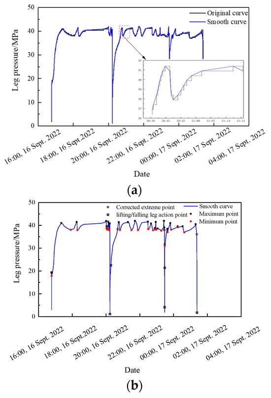 The raw pressure data were multiplatform-type data, which interfered with the peak and trough identification. A discriminant method was employed to initially filter the extreme value points using a comparative approach. When the condition was met, minimum points were identified, and when the condition was met, maximum points were identified. In Equation (5), matrix represents the set of raw data points that resulted in a smoothed dataset denoted as . The finally obtained smooth extreme value envelope is illustrated in Figure 9a.