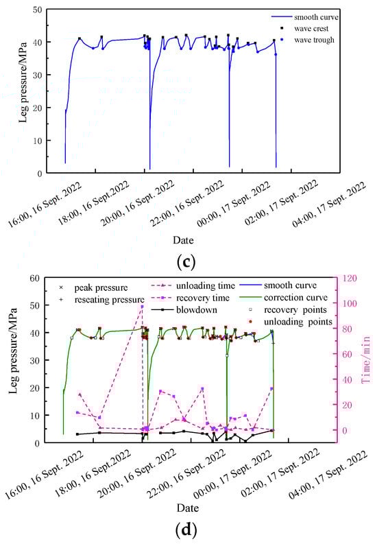 Employing the extreme value envelope, as described in Section 3.2, effectively removed the plateau value located to the right of the extreme point. When the safety valve smoothly opens, the prevalve pressure is intentionally maintained in close proximity to both the peak and trough for a specific duration, as depicted in Figure 4. By referencing the positions of the peak and trough points, a reverse search of the raw pressure data is conducted to ascertain the optimal time to maintain proximity to the peak/trough, resulting in the final curve shape illustrated in Figure 10d.