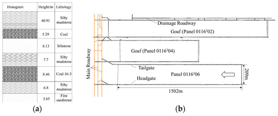 Geological and mining conditions: (a) partial stratigraphic sequence; (b) layout of panel 0116306.