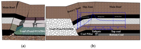 Compared with the ordinary comprehensive mining working face, the mining height of this panel was 8.4 m and was characterized by a substantial overburden rock collapse space. Here, the thickness and layers of the immediate roof increased, and the main roof moved upward [25]. The immediate roof consisted of top coal, silty mudstone, siltstone, and an upper coal seam. Notably, the upper coal seam was left unmined because of its higher gangue content. The main roof was 40 m thick massive silty mudstone. During the mining process, the overburden collapsed in a medium-thick laminated form, and a masonry beam structure formed at the main roof, which rotated or slipped, resulting in a roof weighting, as shown in Figure 12a.
