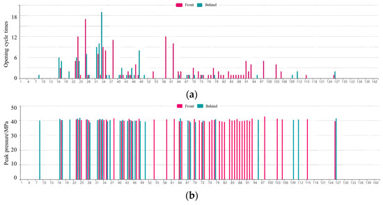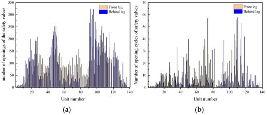 Determination of safety valve opening times: The safety valve opened following the process of starting the overflow, maximum opening, and then returning to seat. Correspondingly, the recovery point, peak pressure, and reseating pressure process formed in the characteristic parameter extraction results. Therefore, the safety valve opening time was defined as being equal to the amount of peak pressure. The statistics of the safety valve opening times of the front and rear columns are shown in Figure 13a.