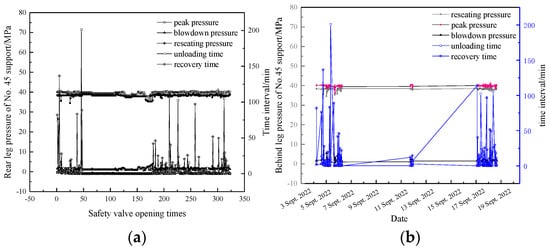 The rear leg pressure of the no. 45 support in the panel, as an example, was separately analyzed from the perspectives of the safety valve opening times and duration, with the results shown in Figure 14.