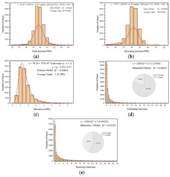Overall distribution status of characteristic parameters for safety valves: (a) peak pressure, (b) reseating pressure, (c) blowdown pressure, (d) pressure recovery time, and (e) unloading time.