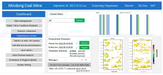 (4) Building upon the SSRI system, a safety valve state monitoring module was developed, offering functions such as parameter configuration, a comprehensive overview of the safety valve’s status, statistics on the safety valve’s opening ratio, individual querying and maintenance, and report statistics. This module was practically applied in mines.