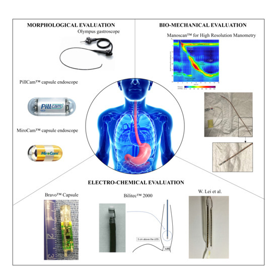 Examples for the investigated categories for morphological, bio-mechanical, and electro-chemical evaluation, which will be further detailed in the next sections. Olympus gastroscope (GIF XQ240, Olympus Corporation, Tokyo, Japan) was selected as a representative example of the conventional white light endoscopy section (Courtesy of Olympus Corp.); PillCam® capsule endoscope by (Medtronic Inc., Minneapolis, MN, USA) is the most clinically-used device in the field of passive wireless endoscopes [14]; MiroCam® capsule endoscope (IntroMedic Co., Ltd., Seoul, Republic of Korea), as an example of magnetically actuated capsules [14]; Bravo™ (Medtronic Inc., Minneapolis, MN, USA) for wireless pH monitoring [15]; Bilitec™ 2000 for bile detection (Cecchi s.r.l., Florence, Italy); catheter for mucosal impedance test by W. Lei et al. [16]; and ManoScan™ for High Resolution Manometry (Medtronic Inc., Minneapolis, MN, USA) (Courtesy of N.d.B.).