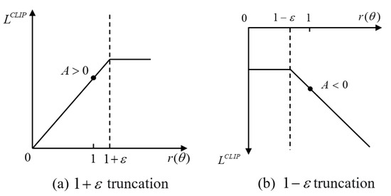 where the clip function is a truncation function that limits the value of the old and new policy parameters to the interval . is a truncation constant used to assist in setting the range of policy updates; it is usually set to 0.1 or 0.2. Figure 5a,b illustrate these two situations of truncation [30], respectively. The pseudo code for the PPO–Clip algorithm is given in Algorithm 1.
