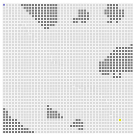 The USV simulation environment in this paper is shown in Figure 7, which is extracted from the data as illustrated in Figure 1. In this environment, the USV is represented by the blue square in the figure. The gray squares represent obstacles. The yellow squares represent the end of the path. USV continuously learns and explores its strategy, following the method proposed in this paper. The entire scene is reset at the end of each round or when the maximum number of time steps is exceeded in a single round. The detection radius of the radar is set to 153 m. In the simulation experiment, the performance indicator values include the iterations used by the USV to reach the end point, the time needed for algorithm convergence, and the average reward obtained. Among them, the step numbers can be reflected by the path diagram of each experiment. The allowable number of the training time steps in this experiment is , and the PPO parameter settings are shown in Table 2. The convergence time and average reward are shown in Table 3.
