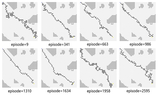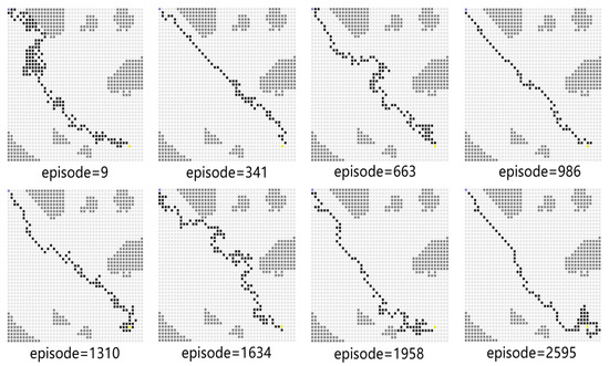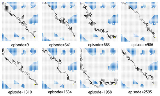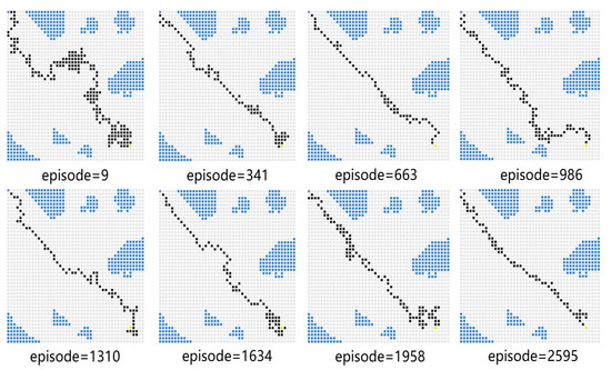 For Experiment 1, the path trace following the proposed algorithm and the convergence tendency of the average reward are shown in Figure 8 and Figure 9, respectively. We also record the snapshot of the paths for the USV to reach the destination in each episode, as shown in Figure 8. The average reward converges when the episode reaches 341. During the training process, with the improvement of the strategy, the number of steps is reduced when the USV reaches the end at each episode. To find a better strategy, the PPO algorithm explores the unknown action space. Therefore, when the episode reaches 1634, the number of steps is increased.