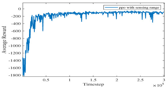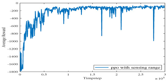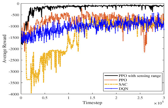 Figure 23 shows the average reward curve of the four algorithms as the time steps increase in a static environment. The algorithm proposed in this paper has less fluctuation in the early training process than the PPO, DQN, and SAC algorithms. As shown in Table 3, the proposed algorithm, PPO algorithm, DQN algorithm, and SAC algorithm converge in 20,400, 59,400, 136,800 and 142,000 time steps, respectively. According to Figure 23, SAC fluctuates greatly before the average reward converges. The proposed algorithm takes advantage of the improved perceptual capability of PPO and accumulates higher rewards. In the late stages of training, the average reward converges to around −117.574.