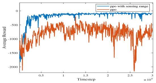 In Figure 10, the vanilla PPO algorithm with zero sensing range is used for path planning under the same environment. It can be seen from the figure that PPO using convolutional layers achieves a better cumulative reward. In the absence of a sensing range, the USV is not able to handle different obstacle environments (see the near-to-end stage of the training process). The experimental results show that increasing the sensing range can greatly improve the convergence efficiency of USV as well as the obstacle-handling capability.