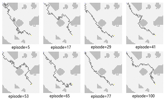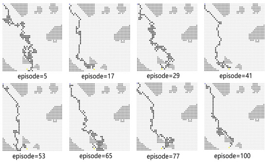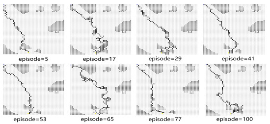 In Experiment 2, the generalization capability of the proposed algorithm is verified by modifying the path endings. The starting point coordinates of the simulation environment remain unchanged, and the end point coordinates are changed from (40, 40) to (19, 44). The path diagram of the test process is shown in Figure 11, which shows that the USV successfully reaches the end point. During the test process, the PPO algorithm will explore the unknown action space to find a better strategy. When the episode reaches 77, the average reward value decreases sharply, and the number of steps is increased. At the 100th episode, the USV uses the least number of steps to reach the end point and receives the highest average reward. After changing the end point of the simulation environment to more complex areas, the models trained by the proposed algorithm can also guide USV to reach the end point. It indicates that the proposed algorithm has a strong generalization capability.