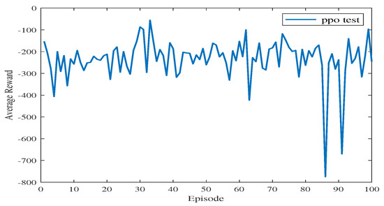 As shown in Figure 9, as the iteration time steps increase, the average reward converges when the algorithm iterates to roughly time steps. The final converged reward fluctuates between −111.34 and −125.55, which shows that the proposed algorithm is basically converging.
