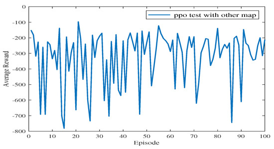 As shown in Figure 18, the blue line represents the average reward convergence diagram after 100 rounds of testing. The average reward is −186.84. After changing the training atlas, the average reward convergence curve obtained is shown in Figure 19, where the solid black line represents the average reward convergence graph after training on a static graph, and the red dotted line represents the average reward convergence graph after training with three static maps.