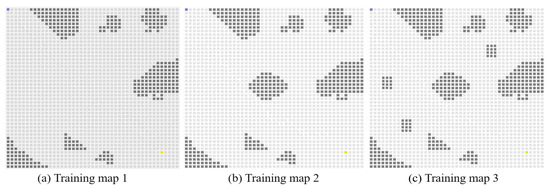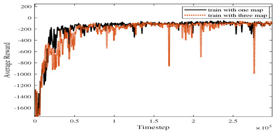 In Experiment 4, we increase the size of the training map sets, and parts of the maps are shown in Figure 15. As shown in Figure 16, the blue line represents the average reward convergence curve obtained by training with the three maps. The final average reward fluctuates between −100.28 and −168.54, indicating that the proposed algorithm basically tends to converge.