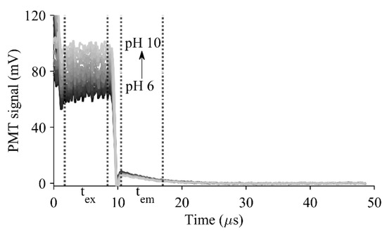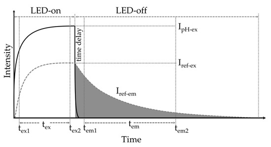 The acquisition of fluorescence excitation and emission intensity was carried out during the excitation period (tex) when the light was switched on (LED-on), and the fluorescence decay period (tem) when the light was switched off (LED-off). The ratio of the excitation and emission-integrated areas was used to determine the pH of the analyte solution (Figure 1).