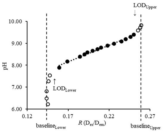 The approximately linear range of the pH sensor (●) was identified using LOD on the R scale, while values in the asymptotes (○) were averaged as baselineLower and baselineUpper and used to establish LOD.