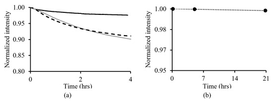 The effect of photobleaching is a factor that cannot be offset using DLR [38]. Studies have shown that immobilization of organic dyes in a sol-gel matrix greatly improves the photostability of the dye molecules [70,71,72]. The sol-gel silica network imposed a caging effect on the dye molecule, hindering the intermolecular motions and reducing diffusion of triplet quenchers, thereby minimizing the reactive singlet oxygen species. Both factors can greatly reduce the photodegradation of the dye molecule.