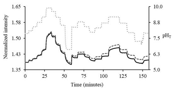 The pH sensor response to pH changes before (⁃⁃⁃) and after photobleaching drift adjustment (▬) over the 150 min experimental period. pH reading from an electrode (…) was used as a reference.