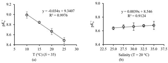 (a) The pKa’ of the pH sensor decreases with increasing temperature. (b) The pH sensor shows a negligible change in pKa’ with increasing salinity. Error bars denote the standard deviation of the associated pKa’.