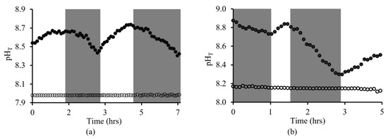 At the end of the undisturbed periods of 12 h and 3 days, respectively, two experiments were conducted over 7 (undisturbed—12 h) and 5 (undisturbed—3 days) hours to examine the influence of DBL build-up over time on pH variations due to metabolic activity changes. The experimental data were acquired every 6 min for 1.5 s with periods of light and dark. The experimental chamber was not isolated in a dark box and the PMT is highly sensitive to any present stray light; thus, data acquisition during the light period was carried out with surrounding lights switched off for a brief 1.5 s, and then the lights were switched on again. A pH sensor coated with a bare sol-gel matrix without luminophores was used to offset background noise. Calibration data were acquired immediately before and at the end of the experiment using 4 Tris buffers (approximately evenly spaced, pHT 8.1 to 9.7). These data were used to apply a time-correlated linear regression [48] to account for sensor drift. The pHT changes in the DBL interface were calculated using Equation (3), and calibration uncertainty based on the equation was presented as 95% CI.